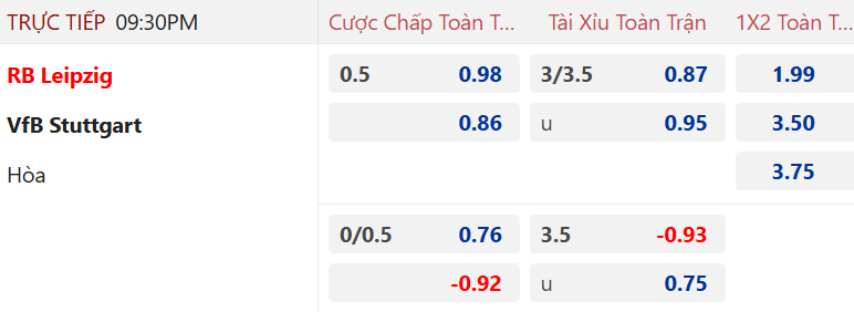 Thị trường châu Á ghi nhận tỷ lệ RB Leipzig chấp hòa trận này, kèo không khác gì lần đối đầu mới nhất giữa đôi bên. Dù RB Leipzig đang có phong độ cao nhưng cũng cần thấy rằng Stuttgart đang thi đấu rất tốt tại Bundesliga. Chưa kể về đối đầu gần đây thì “thiên nga trắng” còn có phần nhỉnh hơn. Thống kê cho thấy cả 4 cuộc đụng độ mới nhất giữa đôi bên thì RB Leipzig đều thất bại trước Stuttgart.