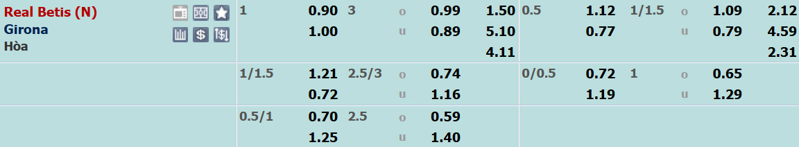 Kèo chấp 0:1 đã thể hiện rõ vị thế của Real Betis ở trận đấu này. Giới đầu tư châu Á có thể tin tưởng thầy trò Pellegrini bởi họ đã thắng kèo châu Á ở 5/7 vòng đấu gần nhất. Qua 6 trận sân nhà, họ cũng thắng 4 trận theo cả tỉ số chuyên môn lẫn tỉ lệ châu Á.