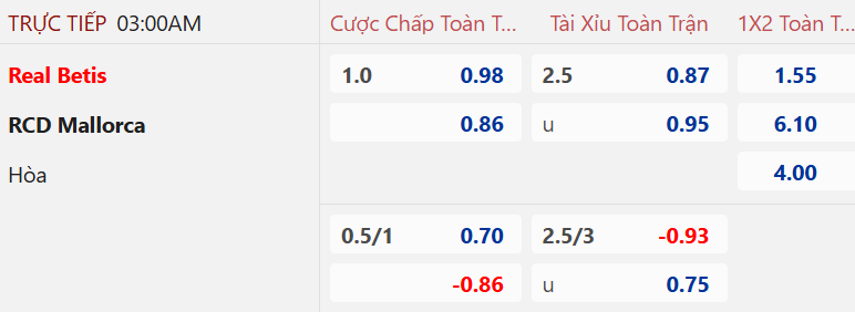 Tỷ lệ hiệp 1 trận này chủ chấp 1/4 trong khi tài xỉu HT là 1 hòa. Nhìn vào handicap cả trận thì có thể thấy tỷ lệ hiệp 1 như vậy là rất “tối” với cửa trên. Đáng ra cả trận chấp 1 trái thì hiệp 1 phải chấp hòa thì cửa trên mới sáng giá. Betis nhập cuộc không mấy ấn tượng và cũng cần biết rằng 2 lần đối đầu gần nhất giữa đôi bên đều có tỷ số hòa ở hiệp đấu đầu tiên.