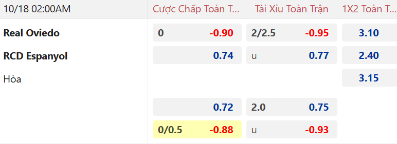Thị trường châu Á ghi nhận tỷ lệ Espanyol chấp về giá, kèo khác biệt so với việc họ bị chấp 1/4 trong lần gần nhất ghé thăm sân của Oviedo. Đội chủ nhà chưa mang đến cảm giác tin cậy và 5 trận mới đây thì Oviedo thua kèo đến 4 lần. Còn về phần Espanyol, họ chưa từng gục ngã trước rào cản handicap ở cả 7 trận sân khách vừa qua.