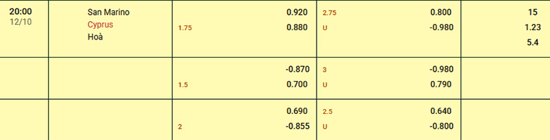 Dù đang gặp khó khăn nhưng Cyprus vẫn được nhà cái đánh giá cao hơn qua mức kèo chấp 1 3/4 trái. Đây là điều không quá bất ngờ bởi San Marino đang sở hữu hàng thủ quá tệ khi nhận trung bình 3,5 bàn trong 1 trận đấu. Điều quan trọng nhất là Cyprus toàn thắng cả 6 lần so tài gần nhất giữa 2 đội và có tới 5 trận liên tiếp vừa qua có cách biệt từ 2 bàn trở lên.