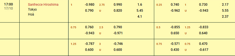 Sanfrecce Hiroshima thi đấu khá thăng hoa trong giai đoạn vừa qua khi thắng kèo tới 5, hòa kèo 1 và chỉ thua kèo 1 trong 7 trận gần nhất. Trong khi đó, Tokyo đang gặp khó khi không thắng kèo cả 2 lượt trận gần nhất. Xét về thành tích đối đầu, Sanfrecce Hiroshima thắng kèo 3 trong 4 lần so tài giữa 2 đội. Với những con số thống kê này, nằm kèo chủ nhà với tỷ lệ chấp 1 hòa vẫn sẽ là sự lựa chọn an toàn cho người chơi châu Á.