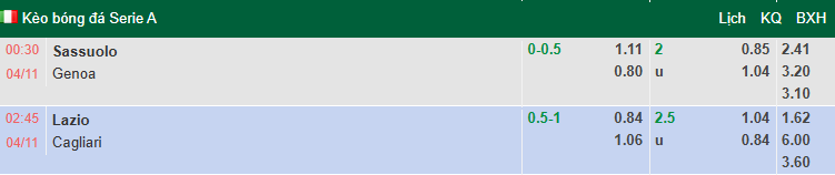 Kèo Tài/Xỉu: Chọn Xỉu - Sau 9 trận ở mùa giải này, Genoa mới ghi được 4 bàn thắng. Trong khi con số tương tự của Sassuolo là 10 bàn. Khả năng nổ Tài với mức kèo 2 hòa rõ ràng bị đánh giá thấp.