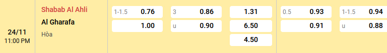 Nhà cái đánh giá Shabab Al Ahli sẽ có một trận thắng cách biệt trước Al Gharafa và nó được thể hiện qua mức kèo chấp 1 1/4 trái. Đây là tỷ lệ kèo vẫn có thể đặt niềm tin vào đội chủ nhà bởi họ đang có chuỗi 3 trận thắng kèo liên tiếp khi được thi đấu dưới mặt sân quen thuộc. Trong khi đó, Al Gharafa thua kèo tới 5/6 trận hành quân xa nhà gần nhất, bao gồm cả 2 trận tại đấu trường Cup C1 châu Á.