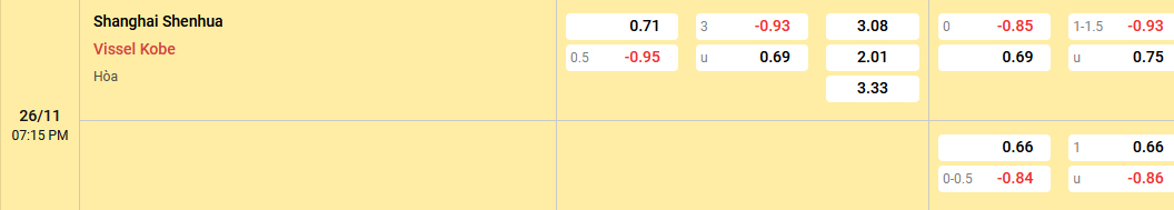 Nhà cái đang niêm yết mức kèo 1/4:0 và nó chứng tỏ Vissel Kobe vẫn được đánh giá cao hơn Shanghai Shenhua. Đây là tỷ lệ kèo vẫn nên đặt niềm tin vào đại diện của Trung Quốc bởi họ thi đấu khá ấn tượng trên sân nhà khi bất bại tới 19/20 trận gần nhất với thành tích thắng 13, hoà 6 và chỉ thua 1. Trong khi đó, Vissel Kobe đang gặp khó khăn trên sân khách khi thua kèo tới 7/8 trận đã qua. Điều quan trọng nhất Shanghai Shenhua đã từng đánh bại Vissel Kobe với tỷ số 4-2 tại sân chơi Cup C1 châu Á hồi đầu năm nay.