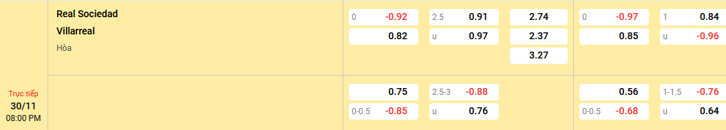 Dù đang thi đấu vào phom cùng điểm tựa sân nhà, nhưng Sociedad vẫn bị đánh giá cửa dưới trước Villarreal. Đây là điều không quá ngạc nhiên bởi Tàu ngầm vàng đang có chuỗi 5 trận thắng liên tiếp tại sân chơi giải quốc nội. Bên cạnh đó, họ cũng thắng kèo tới 4/5 trận hành quân xa nhà gần nhất.