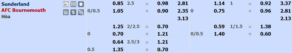 Kèo chấp 1/4:0 đã thể hiện ít nhiều vị thế của Bournemouth ở trận đấu đêm nay. Dù phải chơi trên sân khách nhưng thầy trò Iraola được đánh giá cao về lối chơi phản công. Nhìn lại quá khứ, họ chỉ thua 1/4 màn đụng độ Sunderland gần nhất ở Ngoại hạng Anh (thắng 2, hòa 1, thua 1).