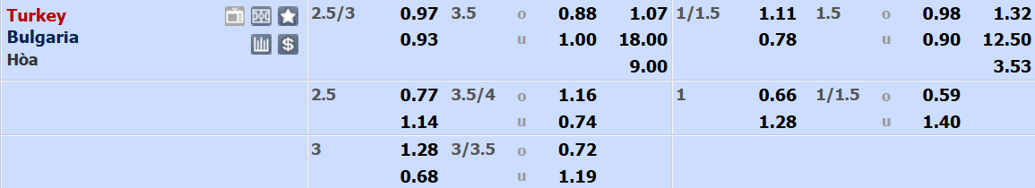 Với kèo chấp 0:2 3/4, Thổ Nhĩ Kỳ hứa hẹn sẽ tạo nên cơn mưa bàn thắng nữa vào lưới Bulgaria. Cơ sở để tin tưởng Thổ Nhĩ Kỳ là hàng công đã ghi 13 bàn/4 trận, trong đó có trận hủy diệt Bulgaria 6-1 ở lượt đi. Với hàng công bùng nổ, thầy trò Montella đã thắng 6/8 trận gần nhất theo cả tỉ số chuyên môn lẫn tỉ lệ châu Á.