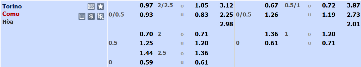 Kèo phụ hấp dẫn: Xỉu hiệp 1 - Theo thống kê, 3/4 trận gần đây của Como ở Serie A đều khép lại hiệp 1 mà không có bàn thắng. 2/3 trận gần nhất của Torino cũng có kết quả tương tự.