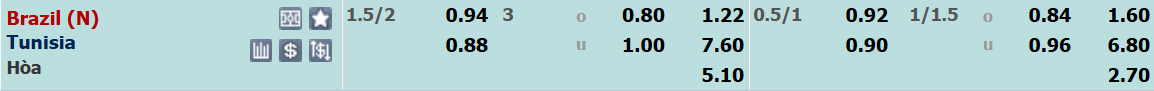Kèo phụ hấp dẫn: Tài hiệp 1 - Theo thống kê, cả 3 trận gần đây của Brazil đều khép lại hiệp 1 với 2 bàn thắng. 3/5 trận gần nhất của Tunisia cũng có kết quả tương tự.
