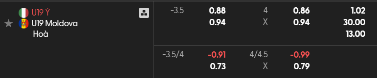 Thị trường châu Á ghi nhận việc U19 Italia chấp tới 3 1/2 ở trận này, nhưng đáng nói là tài xỉu lại chỉ có 4 hòa. Với dạng kèo như vậy thì không nên tin vào cửa trên. Thực tế, U19 Italia không phải điểm đến ưa thích với các nhà đầu tư, khi chỉ thắng kèo 1/6 trận gần đây. Bởi thế, nên mạnh dạn tin vào U19 Moldova ở cuộc chiến này.