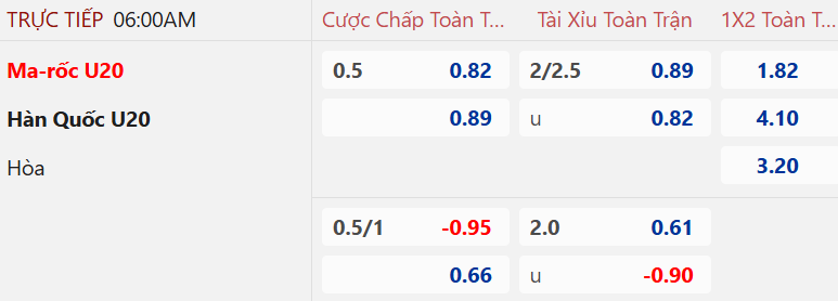Thị trường châu Á ghi nhận kèo U20 Morocco chấp hòa trận này với lợi nhuận thấp. Tỷ lệ đó là khả quan dành cho đại diện của châu Phi. U20 Morocco chơi ổn định và 4 trận gần nhất họ đều không thua trên phương diện châu Á. Trong khi đó, U20 Hàn Quốc có 5 lần thua kèo trong 7 trận có tỷ lệ mới nhất.