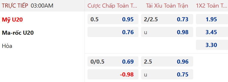 Tỷ lệ hiệp 1 U20 Mỹ dù chấp 1/4 nhưng có điểm bỏ sâu, trong khi tài xỉu là 1 hòa ăn cao cho lựa chọn mốc trên. Tài xỉu HT như vậy là thấp, khó mang đến hy vọng vào sự cởi mở trong hiệp đầu tiên. U20 Morocco thi đấu chắc chắn và 4 trận đã qua của họ thì 3 trận không có bàn ở hiệp 1, trận còn lại cũng chỉ chứng kiến 1 lần lưới rung trong thời gian HT.