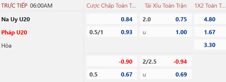 Tỷ lệ hiệp 1 U20 Pháp chấp 1/4 theo như người viết đề cập phía trên thì chiếu sang kèo cả trận, mức handicap HT đó là rất “tối” với cửa trên. U20 Na Uy thường nhập cuộc chắc chắn và đừng quên họ chưa từng lọt lưới trong hiệp 1 ở cả 4 trận từ đầu giải. Bởi vậy, nên tin vào U20 Na Uy ở hiệp 1 trận này.