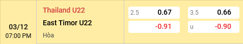 Kèo Tài Xỉu: 7/8 trận vừa qua của U22 Timor Leste khép lại trận đấu nhiều hơn 2,5 bàn thắng. Trong khi đó, 5/7 trận đã qua của U22 Thái Lan kết thúc trận đấu trên 2,5 bàn thắng. Với những con số thống kê này trận đấu ngày hôm nay giữa 2 đội sẽ diễn ra cởi mở và có nhiều bàn thắng được ghi.