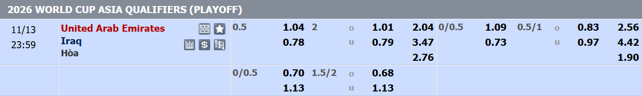 Với ưu thế sân nhà, UAE được xếp ở cửa trên với kèo chấp hòa (0:1/2). Nhưng với phân tích kể trên, Iraq không phải đối thủ dễ chơi. Với hàng thủ chắc chắn, đoàn quân của Graham Arnold có thể kì vọng ít nhất kết quả hòa trước trận lượt về.