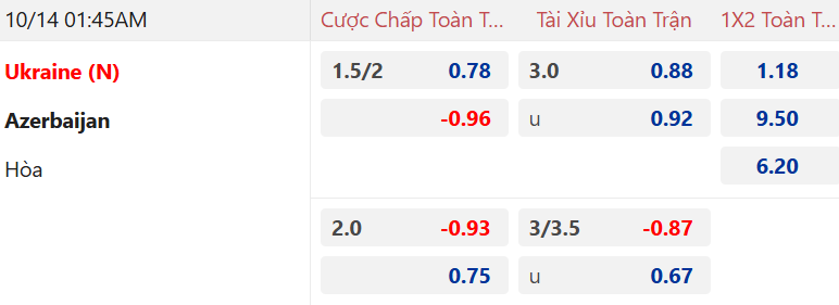 Kèo châu Á trận này Ukraine chấp 1 3/4 mà ăn rất thấp, tỷ lệ cho thấy sự chênh lệch giữa đôi bên đáng kể. Ukraine đã xốc dậy tinh thần và thắng kèo trận gần nhất, trong khi Azerbaijan không đáng tin chút nào với 5/7 trận sân khách thua theo châu Á vừa qua. Vì thế, nên lựa chọn cửa trên ở cuộc chiến này, dù Ukraine không được chơi tại sân nhà.