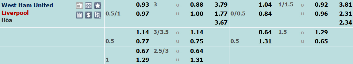 Trên sàn giao dịch, Liverpool được xếp ở cửa trên với tỉ lệ 3/4:0. Có thể thấy The Reds không được đánh giá quá cao vì phong độ quá tệ. Nhưng West Ham cũng không đáng tin cậy bởi họ đã thua 4/6 trận sân nhà ở mùa giải này theo cả tỉ số chuyên môn lẫn tỉ lệ châu Á.