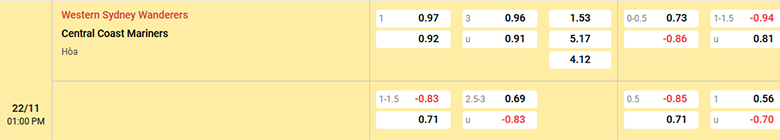 Nhà cái đánh giá khá cao Western Sydney trong màn tiếp đón Central Coast và nó được thể hiện qua mức kèo chấp 1 hoà. Đây là tỷ lệ kèo không nên đặt niềm tin vào đội chủ nhà bởi họ chỉ thắng kèo 1 lần sau 4 trận ra quân. Trong khi đó, đội khách bất bại 3/4 trận đã thi đấu. Điều quan trọng nhất là Western Sydney chỉ thắng kèo 3 lần sau 10 lần so tài giữa 2 đội và thua kèo tới 4/5 lần khi đón tiếp Central Coast trên sân nhà.