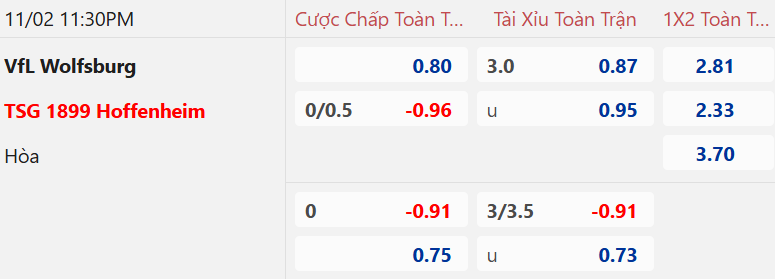 Tỷ lệ hiệp 1 Hoffenheim chấp về giá ăn ít và tài xỉu là 1 1/4 có lợi nhuận tương đối cân bằng cho các lựa chọn đối lập. Tỷ lệ HT như vậy là khả quan hơn với Hoffenheim. Wolfsburg nhập cuộc chậm chạp ở sân nhà khi 3 vòng đấu tiếp khách gần nhất họ đều tịt ngòi trong hiệp 1 đồng thời bị dẫn trước ở thời gian HT.