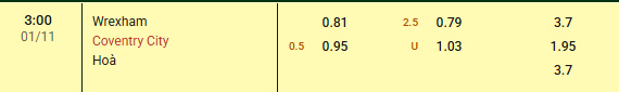 Nhà cái đang niêm yết mức kèo 1/2:0 và nó cho thấy Coventry City được đánh giá cao hơn Wrexham. Đây là tỷ lệ kèo ngon ăn nếu đặt kèo cho thầy trò HLV Lampard bởi họ đang có chuỗi 6 trận thắng kèo liên tiếp vừa qua. Trong khi đó, Wrexham chỉ thắng kèo đúng 1 lần trong 6 trận gần nhất trên sân nhà tại sân chơi giải Hạng nhất Anh.