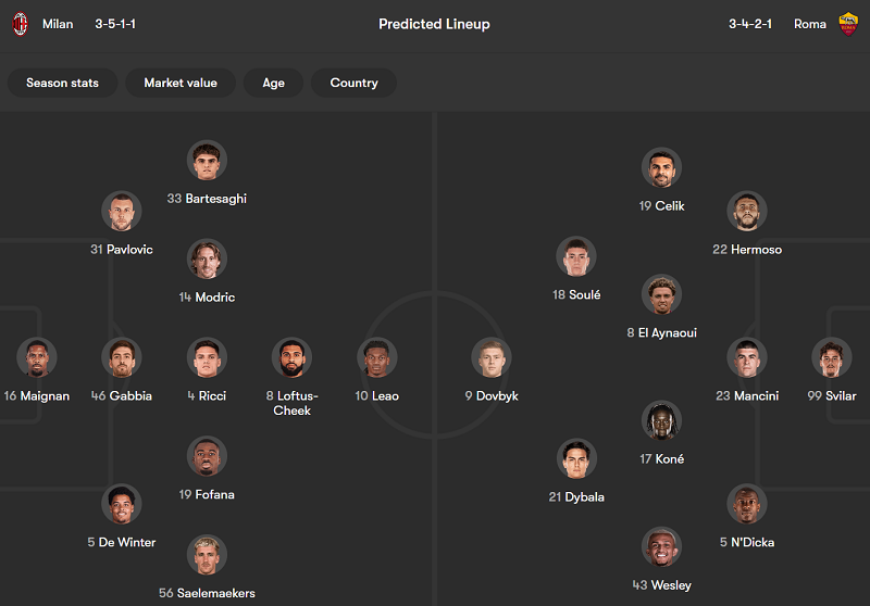 - AC Milan: Adrien Rabiot và Christian Pulisic chưa bình phục chấn thương; Fikayo Tomori và Santiago Gimenez chưa chắc chắn về khả năng ra sân.