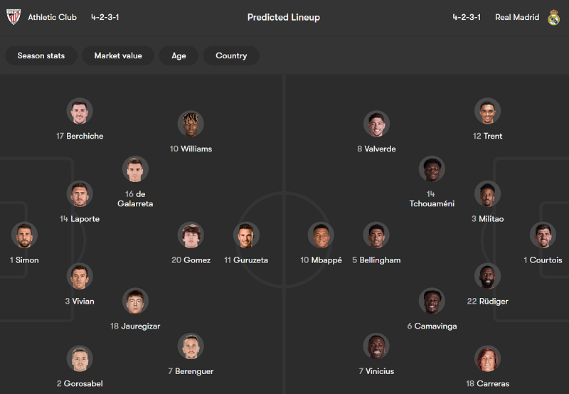 - Athletic Bilbao: Robert Navarro, Unai Eguiluz, Benat Prados và Maroan Sannadi chưa bình phục chấn thương; Inaki Williams chưa chắc chắn về khả năng ra sân.
