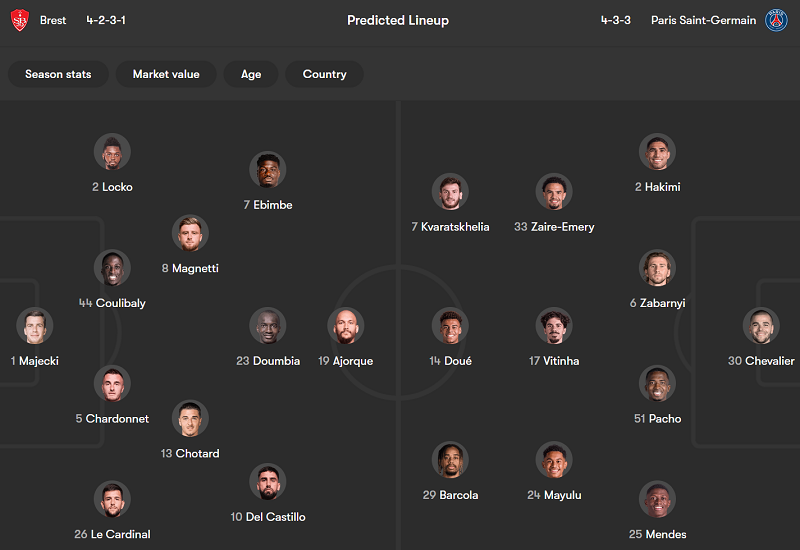Tại Ligue 1 mùa 2025/26, PSG hiện xếp thứ 2 với 1 điểm ít hơn Marseille: 17 so với 18. Trong khi đó, Brest thu về 9 điểm từ 8 vòng đấu, ghi tổng cộng 14 bàn thắng và nhận 14 bàn thua. Brest bất bại toàn bộ 4 trận vừa qua: thắng 2, hòa 2.