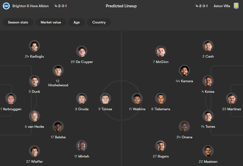 - Brighton: Adam Webster, James Milner và Solly March chưa bình phục chấn thương; Georginio Rutter, Kaoru Mitoma và Tom Watson chưa chắc chắn về khả năng ra sân.