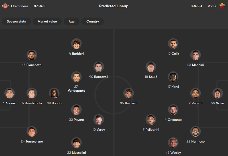 - Cremonese: Mikayil Faye chưa bình phục chấn thương; Alessio Zerbin, Michele Collocolo và Faris Moumbagna chưa chắc chắn về khả năng ra sân.