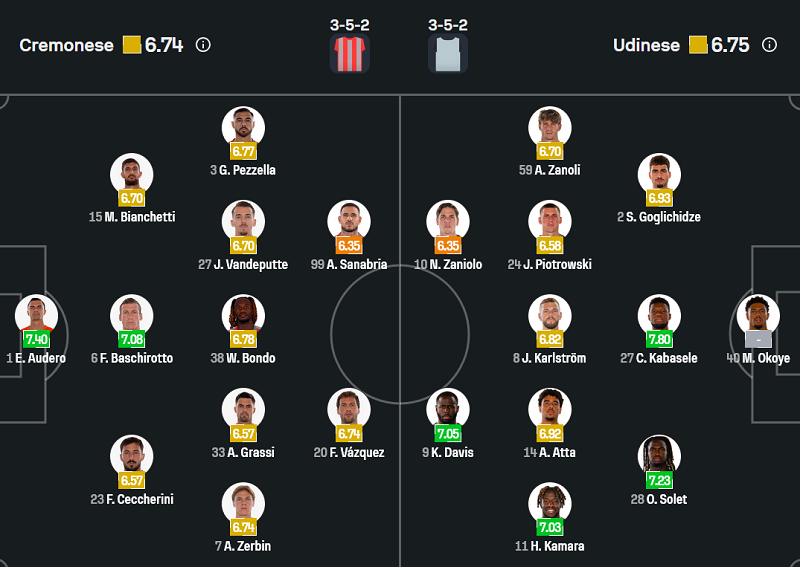Đội hình dự kiến Cremonese vs Udinese (theo SofaScore)