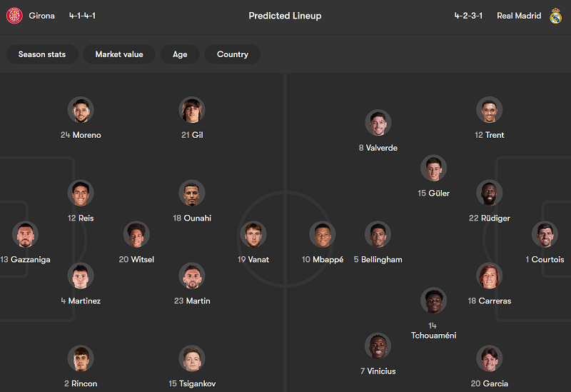 - Girona: Ricard Artero, Juan Carlos, Daley Blind, Donny van de Beek, Thomas Lemar và Cristian Portu chưa bình phục chấn thương; Alejandro Frances, David Lopez và Vladyslav Krapyvtsov chưa chắc chắn về khả năng ra sân.
