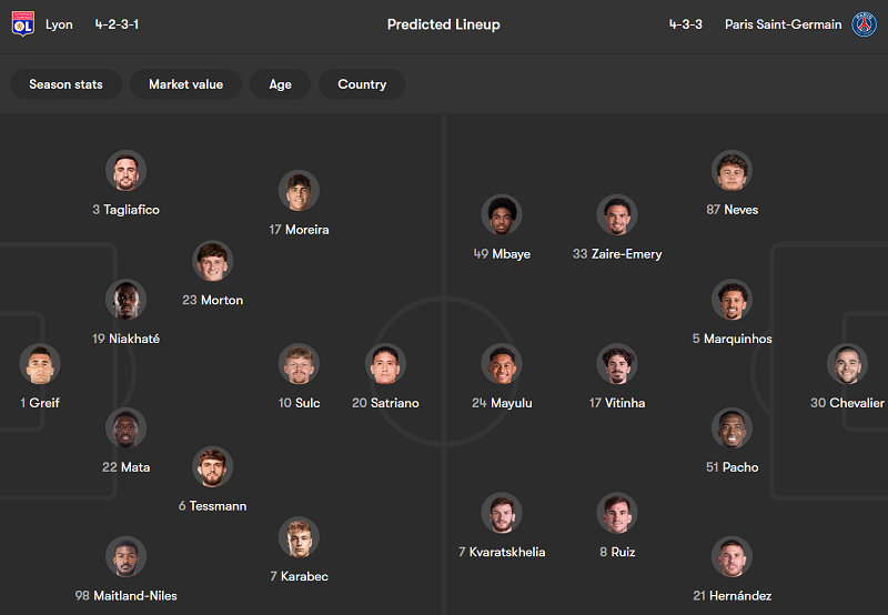 - Lyon: Orel Mangala, Ernest Nuamah và Malick Fofana chưa bình phục chấn thương; Abner và Hans Hateboer không thể thi đấu vì lý do thẻ phạt.