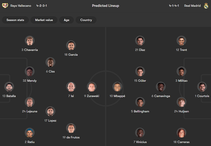 Tại LaLiga, tập thể do HLV Xabi Alonso dẫn dắt giành 30/33 điểm tối đa từ 11 vòng đấu. Los Blancos ghi tới 26 bàn thắng, trong đó có 13 pha lập công của Kylian Mbappe. Rayo Vallecano thu về 14 điểm (thắng 4, hòa 2, thua 5), ghi cả thảy 12 bàn thắng (chưa bằng một mình Mbappe) và nhận 14 bàn thua.