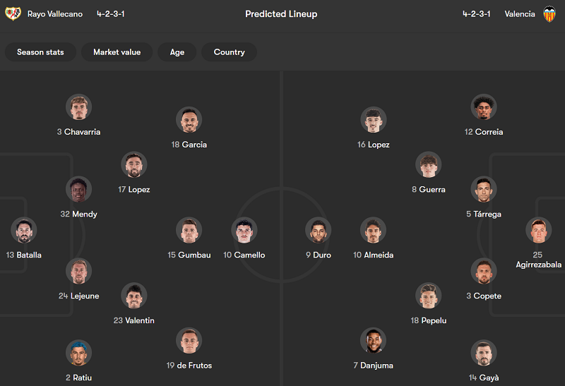 - Rayo Vallecano: Abdul Mumin, Oscar Trejo và Pedro Diaz chưa bình phục chấn thương; Isi Palazon và Pathe Ciss không thể thi đấu vì lý do thẻ phạt; Ivan Balliu và Randy Nteka chưa chắc chắn về khả năng ra sân.