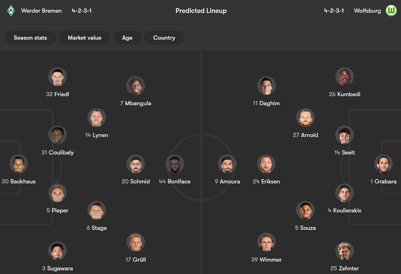 - Wolfsburg: Joakim Maehle, Kilian Fischer, Rogerio, Kevin Paredes và Jesper Lindstrom chưa thể tái xuất; khả năng ra sân của Bence Dardai, Lovro Majer và Yannick Gerhardt còn bỏ ngỏ.