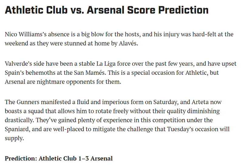 Theo chuyên gia James Cormack, Athletic Bilbao không thể tạo ra bất ngờ khi thua Arsenal với tỷ số 1-3.
