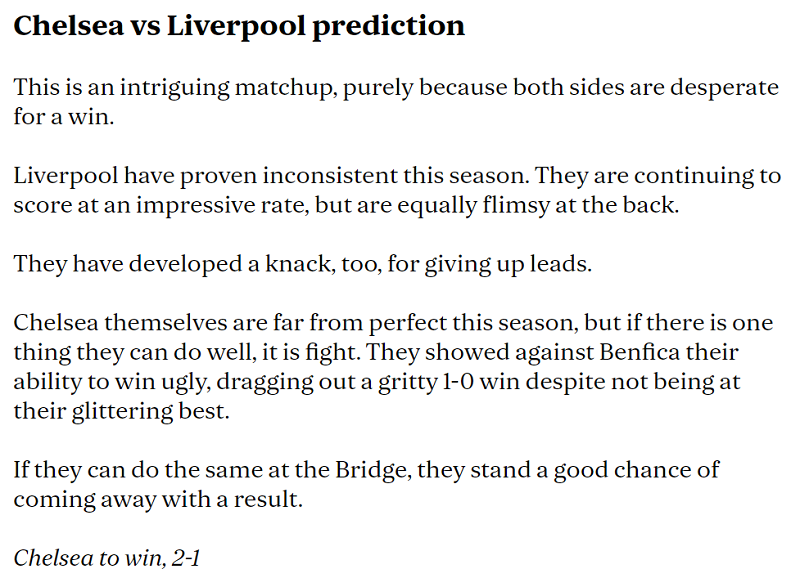 Theo chuyên gia Arthur Ferridge của Evening Standard, Chelsea sẽ thắng Liverpool với tỷ số 2-1.