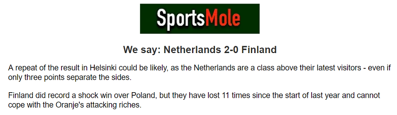 Theo chuyên gia Jonathan O’Shea của Sports Mole, Hà Lan sẽ thắng Phần Lan với tỷ số 2-0.