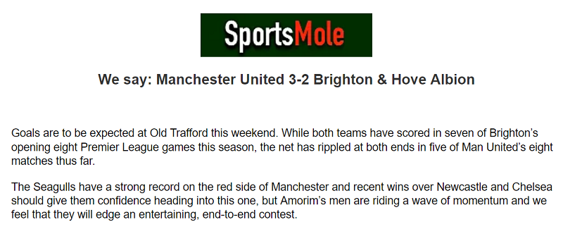 “Bàn thắng được dự đoán sẽ xuất hiện tại Old Trafford vào cuối tuần này. Cả hai đội đều đã ghi bàn trong 7/8 trận mở màn Premier League mùa hiện tại của Brighton. Năm trong 8 trận của Man United cũng chứng kiến hai đội cùng có được các pha lập công.