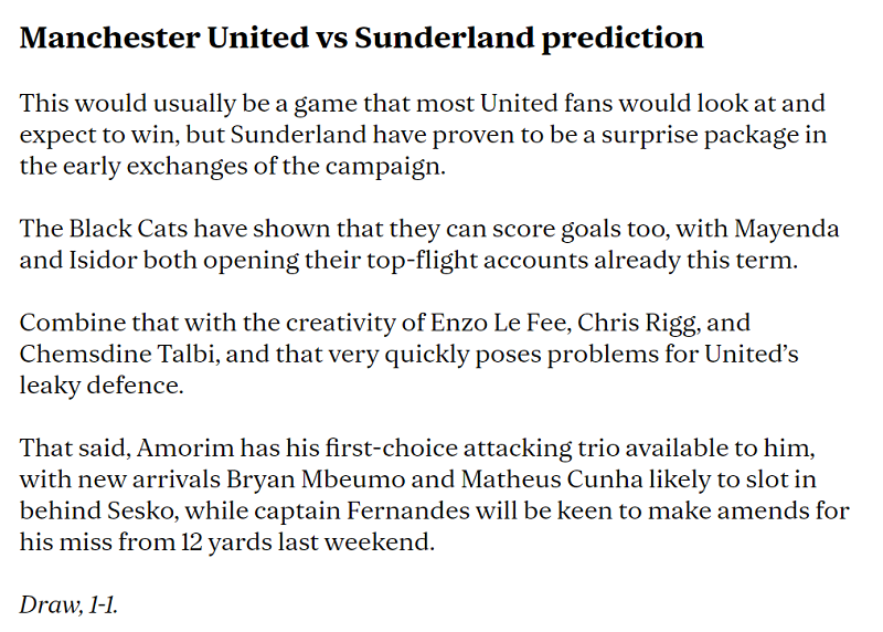 “Đây thường là trận đấu mà hầu hết người hâm mộ của United đều mong đợi và kỳ vọng chiến thắng nhưng Sunderland đã chứng tỏ mình là một bất ngờ ngay từ những màn so tài đầu mùa.