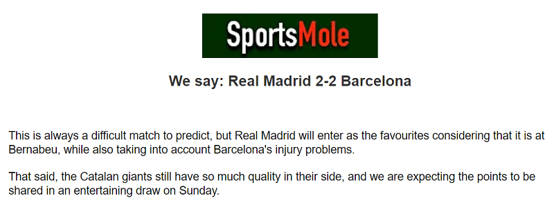 “Đây luôn là trận đấu khó dự đoán nhưng Real Madrid sẽ được đánh giá cao hơn khi được thi đấu tại Bernabeu đồng thời cũng cân nhắc đến vấn đề chấn thương của Barcelona.